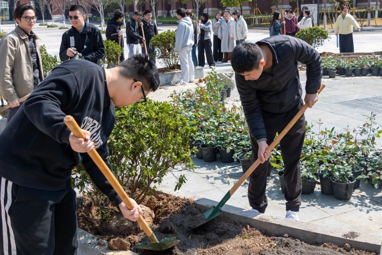 在校园种植场地,同学们开启“把烦恼种进土里”的栽种实践。老师现场示范栽种技巧,指导大家规范完成挖坑、栽植、覆土等步骤,将杜鹃花树轻轻埋入泥土,寓意让烦恼化作春泥,孕育新生绿意,在劳动中践行生态文明理念。